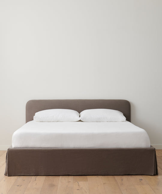 Rounded upholstered headboard featuring luxurious Belgian Libeco linen: 91% linen, 9% nylon. Features a removable Libeco slipcover for everyday ease and a Birch frame.