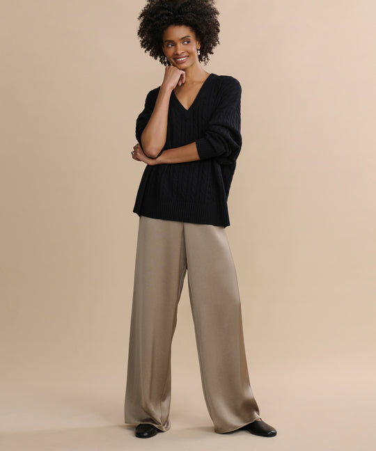The comfort of a pull-on pant, the look of a luxe trouser—this elevated pair is the best of both worlds. With an effortless drape, pair this with an oversized or relaxed knit for a lush, flowy look.